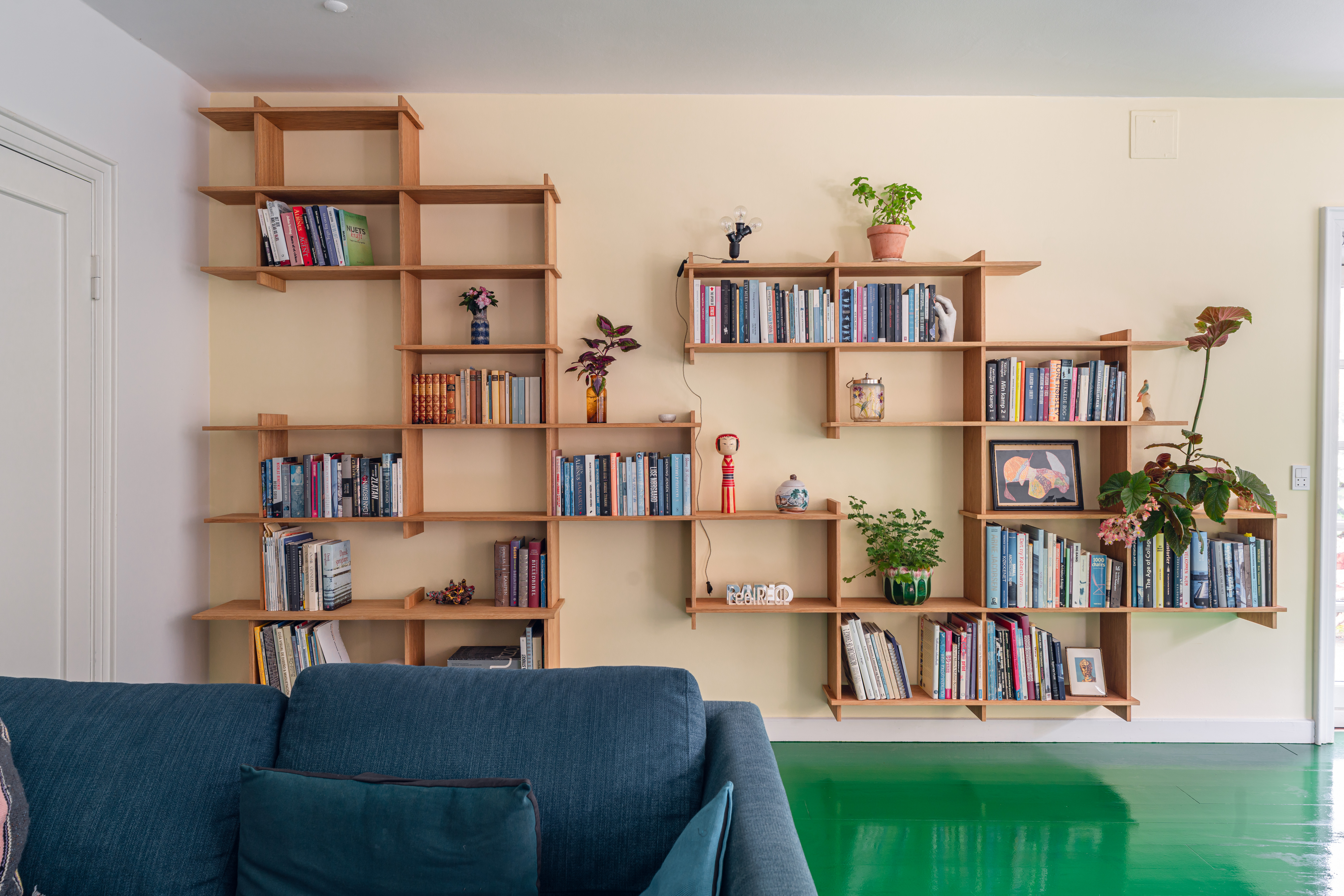 Plante og bøger på eg-reol.